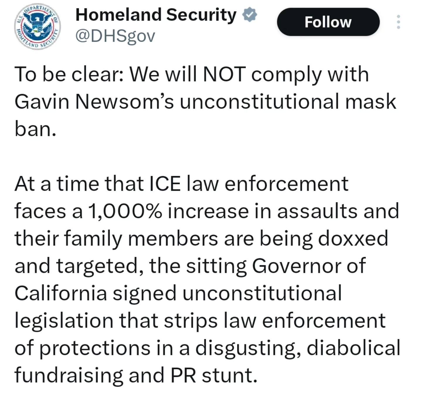 The Trump administration is now openly defying State laws and sovereignty (not to mention their own Federal law)—and not only not hiding it, but openly boasting about it. Witness a tweet by the Department of Homeland Security this week: “To be clear: We will NOT comply with Gavin Newsom’s unconstitutional mask ban. At a time that ICE law enforcement faces a 1000% increase in assaults and their family members are being doxxed and targeted, the sitting governor of California signed unconstitutional legislation that strips law enforcement of protections in a disgusting, diabolical fundraising and PR stunt.”