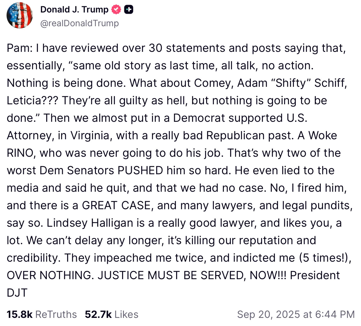 Ordered his attorney general, Pam Bondi—over social media, it ought to be said—to expedite the repression and prosecution of his political opponents. Yesterday, his old political nemesis, James Comey, was indicted for making a false statement to Congress way back in September 2020. Another political enemy, former Trump national security advisor John Bolton, is currently under investigation by the Department of Justice. New York Attorney General Letitia James is rumored to be next in line to face federal indictments.
