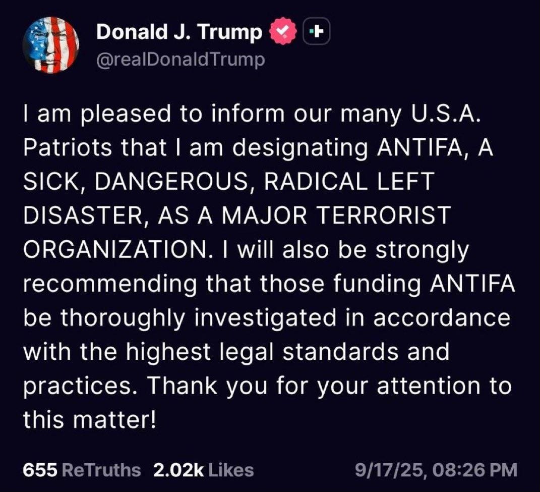 And then there was the President himself. Trump wasted no time, signing an executive order to designate “Antifa” (shorthand for “anti-fascist”)—an amorphous collection of leftwing activist groups with no leadership, fundraising, or organizational structure—as a “domestic terrorist organization.” Yesterday, he also signed another executive order to “dismantle” left-wing domestic terrorist networks. The order authorizes the FBI’s Joint Terrorism Taskforce and other federal agencies like the Treasury Department and IRS “to identify and disrupt financial networks that fund domestic terrorism and political violence.”