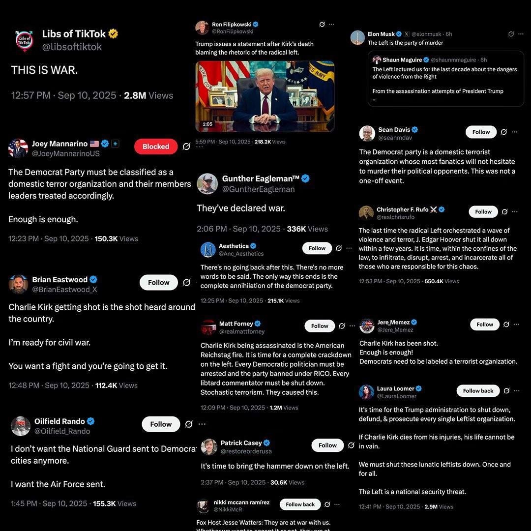 Talk of civil war and repression, primarily coming from an outraged rightwing mediasphere, was especially alarming. “The Democratic Party must be classified as a domestic terror organization and their members leaders treated accordingly. Enough is enough,” Joey Mannarino stated. “Charlie Kirk getting shot is the shot heard around the country. I’m ready for civil war. You want a fight and you’re going to get it,” said Brian Eastwood. “The Left is the party of murder,” Elon Musk chimed in on X. Also, Elon Musk: “Either we fight back or they will kill us.”