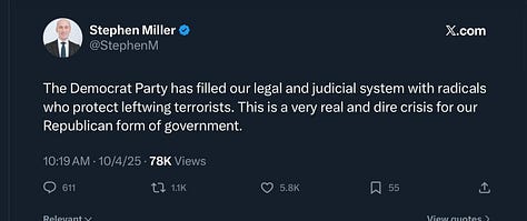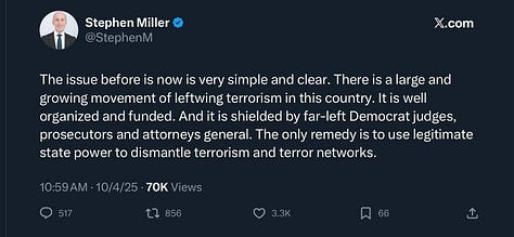 Meanwhile, Chicago Mayor Brandon Johnson held an extraordinary press conference in which he asserted that Trump and “the right wing of this country wants a rematch of the Civil War. The President of the United States of America has declared war on the people of Chicago and people across America.” Johnson announced that they were passing a city ordinance to create “ICE-free zones,” essentially, city property where ICE could not enter or operate. He encouraged private businesses to also sign on to this initiative.
